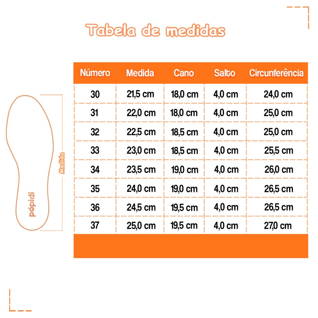 BOTA TEXANA BORDADA Tamanho da Forma: Normal - Recomendamos que compre o tamanho habitual. Cores Disponíveis: * PRETO * OFF WHITE * CAFÉ Especificação Técnica: Tipo de produto: Galocha estilo texana Material externo: Sintético PVC Material interno: Têxtil Sola: PVC Peso médio do produto: 825g Altura da sola: 4cm Fechamento: Zíper Numeração: Será enviada pelo critério de escolha Embalagem: Cada par vai na sua caixa individual. Tabela de medidas 30 ---------------- 21,5 cm 31 ---------------- 22,0 cm 32 ---------------- 22,5 cm 33 ---------------- 23,0 cm 34 ---------------- 23,5 cm 35 ---------------- 24,0 cm 36 ---------------- 24,5 cm 37 ---------------- 25,0 cm Como medir: Coloque o pé em cima de uma folha de papel e risque em volta dele com um lápis ou caneta. Meça o comprimento do topo até a base do contorno e adicione 0,5 cm de folga. Limpeza e Conservação: Evite usar substâncias abrasivas como álcool, detergentes ou solventes nos calçados, usar produtos neutros. Nunca os deixe de molho ou lave na máquina. A secagem deve ser feita em temperatura ambiente e na sombra, nunca no sol ou em máquinas. Dicas Pópidi Com a nossa linda Bota Texana Bordada, sua pequena vai arrasar com muito estilo e personalidade! Produzida em material injetado, ela une praticidade e conforto de uma verdadeira texana. O bico fino traz aquele charme clássico do estilo country, enquanto o solado antiderrapante garante mais segurança nos momentos de diversão. Combine com calça jeans e camiseta básica para um visual casual e estiloso ou, se preferir, aposte em vestidinhos leves ou saias para um contraste moderno e delicado. Para um toque country, adicione camisa xadrez ou chapéu e crie uma produção divertida e autêntica. Sobre a marca Conectados com o universo infantil através de produtos que transmitem nossos valores, a Pópidi acompanha o dia a dia da criança com muito respeito, dedicação e atitude, desde o nascimento até a pré-adolescência. Oferecemos proteção, conforto e estilo, buscando sempre inovar a cada lançamento. Cuidando com excelência da relação pré e pós-vendas, afinal a satisfação de nossos clientes é muito importante para nós. Atendimento: Segunda à sexta: 07:00 às 18:00 Sábado: 08:00 às 12:00 Boas compras e volte sempre!!!