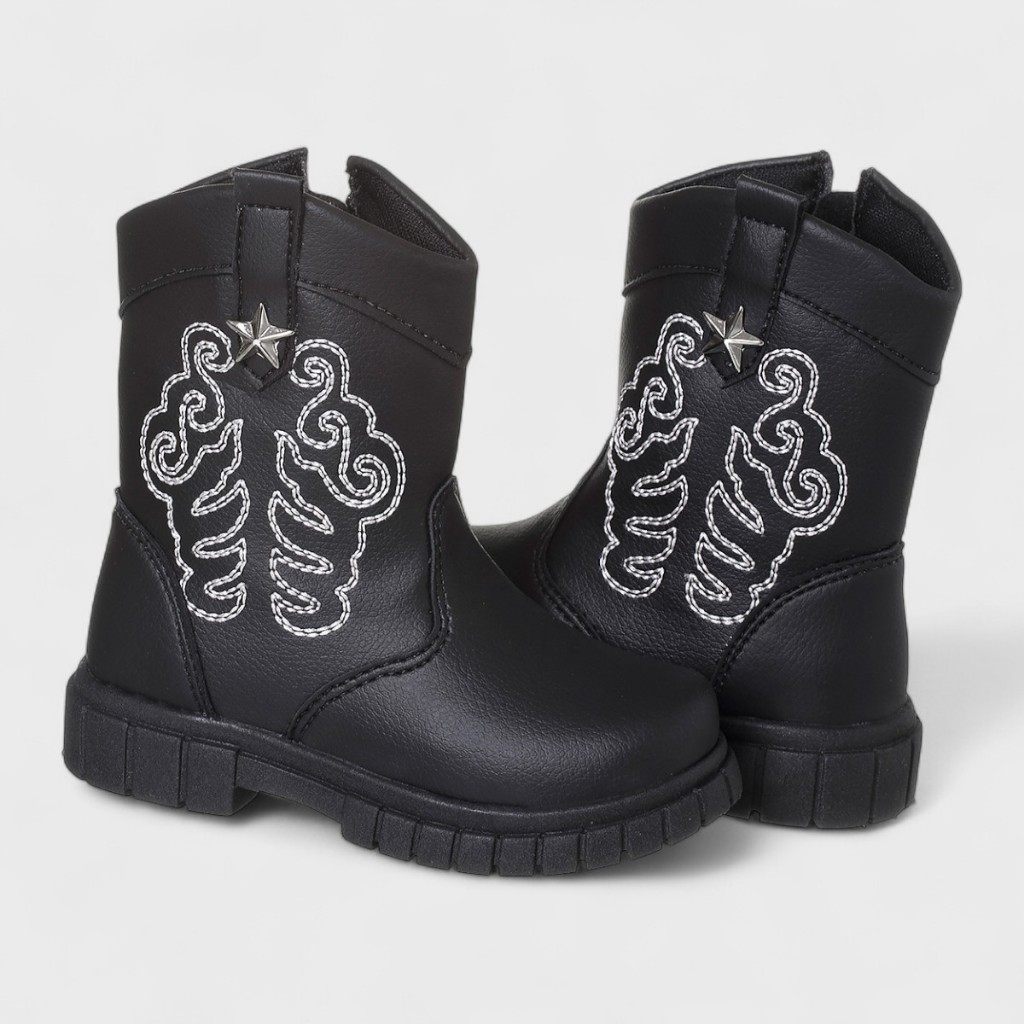 Esta bota infantil feminina é perfeita para as pequenas que gostam de um visual country estiloso e confortável. Confeccionada em material sintético resistente, apresenta um design clássico com cano médio, combinando preto e detalhes em bordado para um toque rústico e elegante. TABELA DE MEDIDAS N° 22 - 14,7 cm N° 23 - 15,5 cm N° 24 - 16 cm N° 25 - 16,8 cm N° 26 - 17,5 cm N° 27 - 18 cm