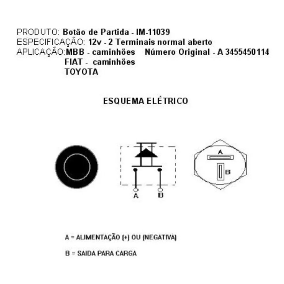 Botão de Partida 2 terminais - Mercedes: Caminhões e ônibus, Fiat: Caminhões, Toyota: Utilitários, CBT: Tratores