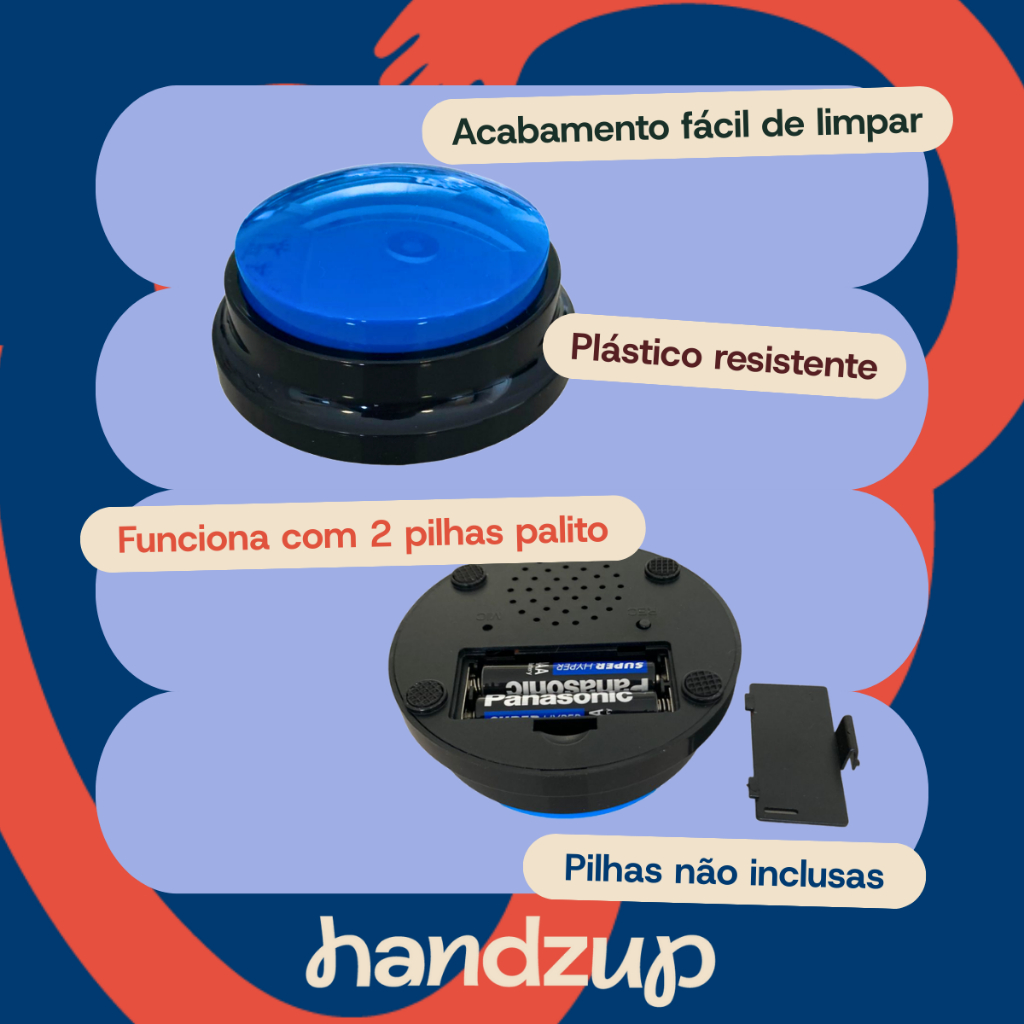 Botão Regravável para Adestramento para Cães e Gatos com Comando de Voz Ideal para cães e gatos, este botão permite a gravação e reprodução de mensagens de até 30 segundos. Características do Produto: Comunicação Personalizada: Grave comandos como “comer”, “passear” e “brincar” para treinar seu pet de forma eficaz. Quando seu animal pressionar um botão, recompense-o com a ação correspondente para reforçar o aprendizado. Versatilidade de Uso: Além do adestramento de pets, os botões são ótimos para estimular a fala de bebês e crianças, e podem ser usados em jogos e atividades com amigos. Qualidade de Gravação: Os botões oferecem uma gravação clara e precisa, permitindo que seu pet responda e reconheça comandos personalizados. Fácil Manuseio: Para gravar, pressione o botão REC, mantenha-o pressionado enquanto fala e solte-o quando terminar. Ouça a gravação e clique no botão para reproduzir. Transforme o treinamento do seu pet e aproveite a versatilidade dos nossos botões regraváveis. Adquira o seu agora e facilite a comunicação com seu amigo de quatro patas! Especificações: Cada botão é alimentado por duas pilhas AAA (não incluídas) Contém: 1 botão (1 unidade)