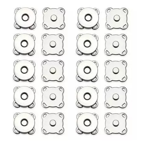 Botão imantado (imã) contendo uma unidade Tamanho: 18 mm. Botão que requer costura. 100 Unidades/Pares Cor: Prata Botão Magnético ou Botão de Imã com furos laterais para costura, pode ser aplicado em bolsas, carteiras, necessaires e todo tipo de artesanato e artigos de patchwork. Permite um acabamento fino para as suas peças, este botão pode ser fixado manualmente, não necessita matriz para aplicação. Perfeito para bolsas, carteiras e demais acessórios.