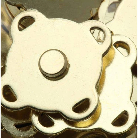 Botão imantado (imã) contendo uma unidade Tamanho: 18 mm. Botão que requer costura. 20 Unidades/Pares Cor:Dourado Botão Magnético ou Botão de Imã com furos laterais para costura, pode ser aplicado em bolsas, carteiras, necessaires e todo tipo de artesanato e artigos de patchwork. Permite um acabamento fino para as suas peças, este botão pode ser fixado manualmente, não necessita matriz para aplicação. Perfeito para bolsas, carteiras e demais acessórios.