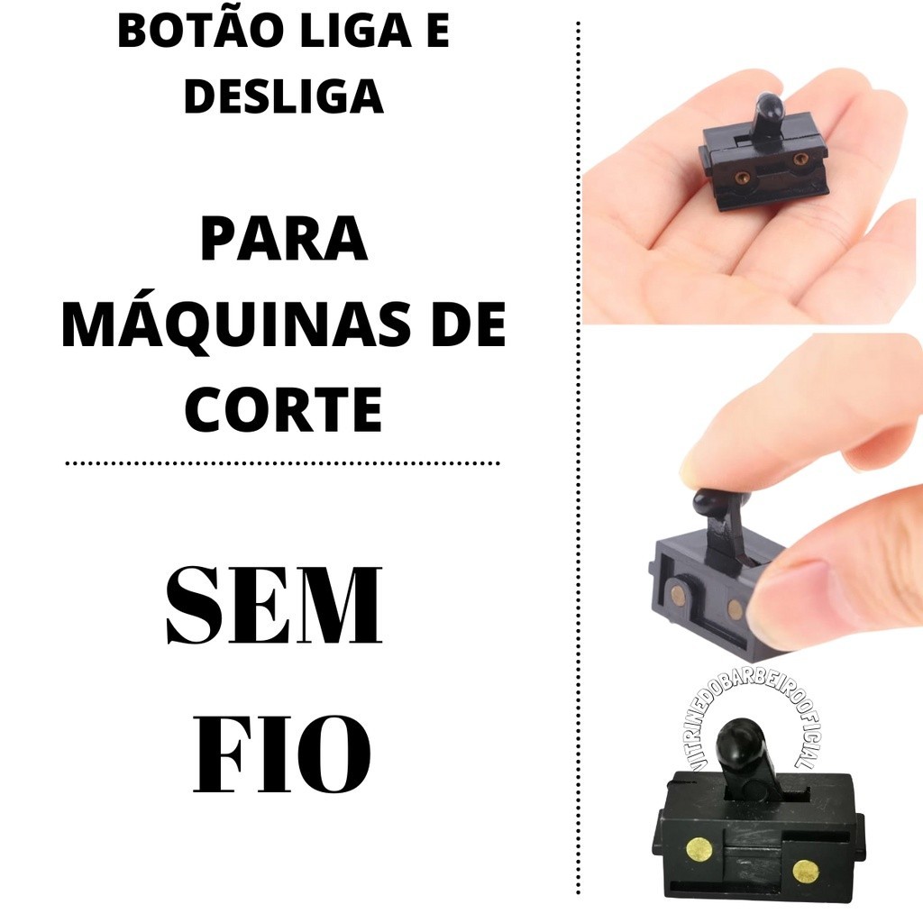 CHAVE LIGA E DESLIGA PARA MÁQUINAS DE CORTE SEM FIO - É UMA PEÇA DE REPOSIÇÃO PARA AS MÁQUINAS DE CORTE WAHL, KEMEI E WMARK; - O DIFERENCIAL DA NOSSA CHAVE É QUE ELA AJUSTA NA SUA MÁQUINA DE CORTE SEM FOLGA; - QUANDO A CHAVE É LIGADA, A MÁQUINA NÃO FICARÁ TREPIDANDO COM MAL CONTATO E TERÁ UMA DURABILIDADE MAIOR EM VIDA ÚTIL; - ACONSELHAMOS QUE ANTES DE REALIZAR A COMPRA VERIFIQUE SE SUA MÁQUINA POSSUI ESSA CHAVE INTERRUPTORA DE LIGA E DESLIGA; - TIRE OS PARAFUSOS DA SUA MÁQUINA; - TIRE A TAMPA E CONFIRME SE SUA CHAVE É A MESMA DA FOTO; ***OBSERVAÇÃO: A CHAVE NÃO SERVE NAS MÁQUINAS DE CORTE COM FIO ***ATENÇÃO - DEVIDO AOS INÚMEROS MODELOS DE MÁQUINAS DE CORTE NO MERCADO; - O MAIS INDICADO É FAZER A CONFIRMAÇÃO ANTES DA COMPRA, SEGUINDO AS RECOMENDAÇÕES NA DESCRIÇÃO DESTE ANÚNCIO. Item Incluso: 01 CHAVE LIGA E DESLIGA PARA MÁQUINAS DE CORTE SEM FIO =================================================================== *** Confira todos os nossos Produtos "EM MAIS ANÚNCIOS DO VENDEDOR", adicione ao carrinho e tenha o frete grátis oferecidos pela Shopee*** - Compra 100% Segura Pela Shopee, garantindo segurança da sua compra do início ao fim. Se por ventura houver algum problema a Shopee devolve seu dinheiro de forma prática e sem burocracia. - Todos nossos produtos com 7 dias de garantia. - Todos nossos produtos são a pronta entrega e temos o envio mais rápido da Shopee. Após a confirmação do pagamento seu pedido é enviado em até 24h. - Temos Satisfação em te Oferecer Produtos de Alta Qualidade! - Todas as fotos de nossos produtos são reais. - Adicione seus produtos no carrinho e Boas Compras!!! - Qualquer dúvida estamos á disposição! - Temos Satisfação em Atendê-lo (a).