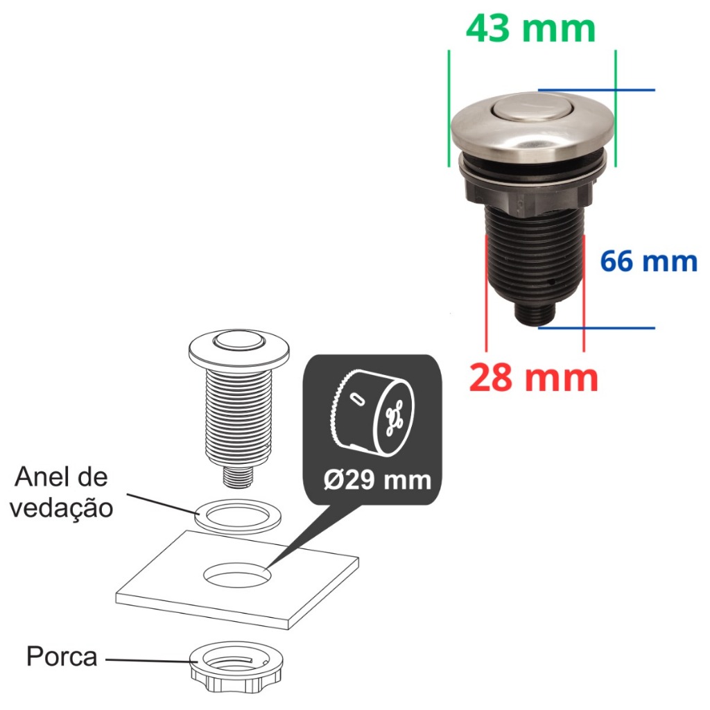 --> Botão pneumático cromado INOX + Mangueira - SEM FONTE<-- UNICO EM INOX DE VERDADE, NÃO DESCASCA!! Peça de Reposição. ESPECIFICACOES: - Botão de acionamento Pneumático Cromado - Diâmetro de furação: 28mm - Diâmetro do espelho: 43mm ITENS INCLUSOS: - 01 Botão pneumático - 01 Mangueira cristal com 1 METRO