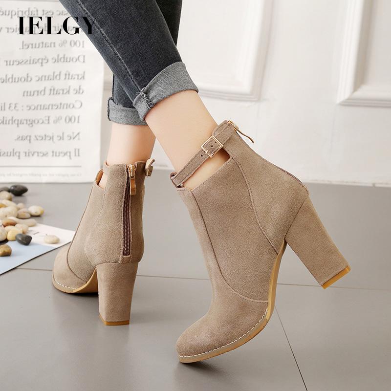 Botas De Camurça Com Salto Grosso Estilo Britânico IELGY Zíper Traseiro