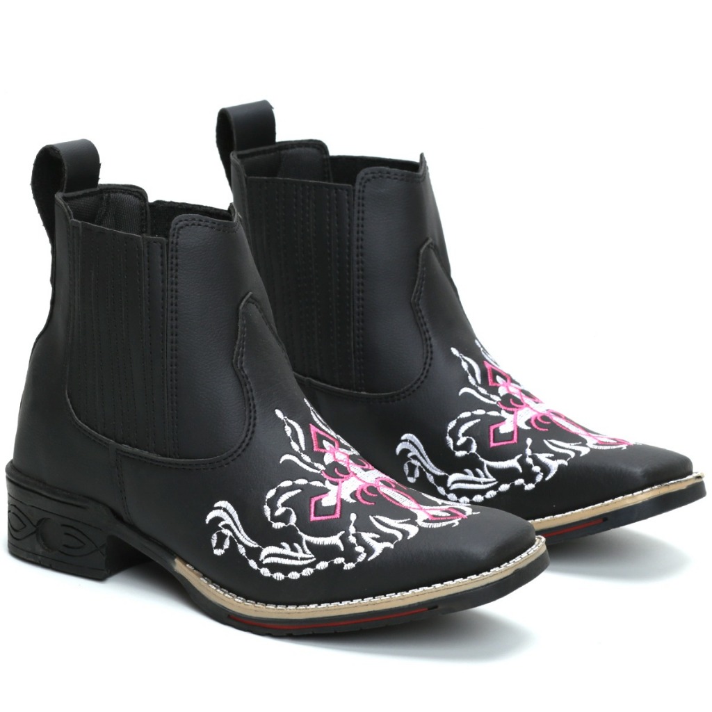 Botina Bota Country Texana Feminina Bico Quadrado Preta Bordado