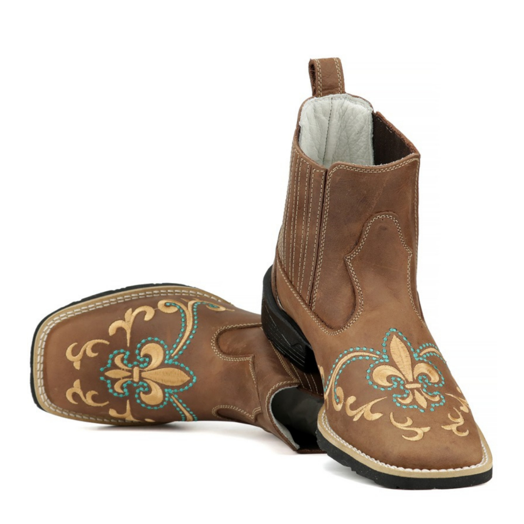 Botina Texana Couro Legítimo Fóssil Bordado Flor Confort Solado Borracha Costurado Bico Quadrado