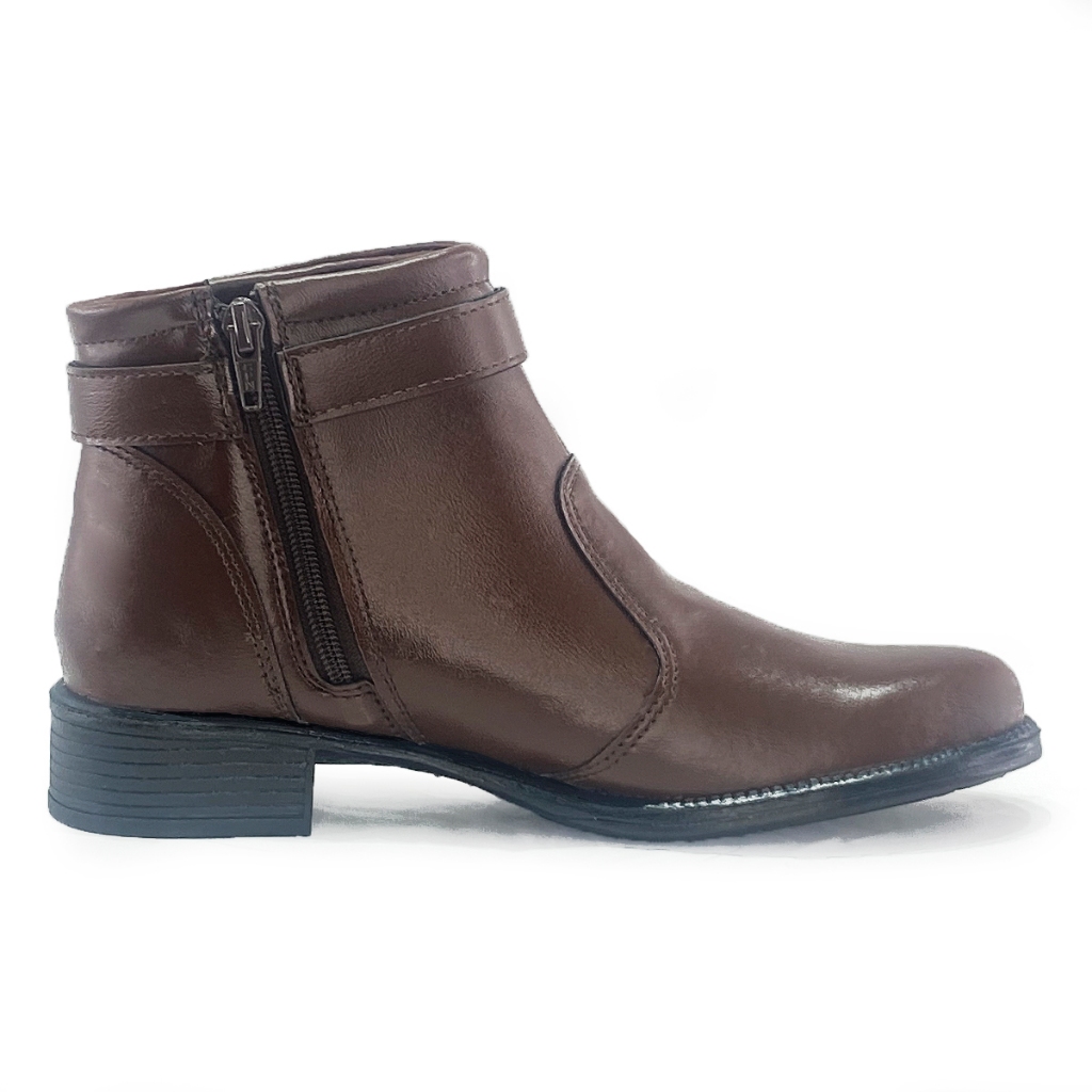Botinha Feminina Salto Baixo com Fivela e Ziper Couro Ecológico Marrom Linha Veneza Kapell