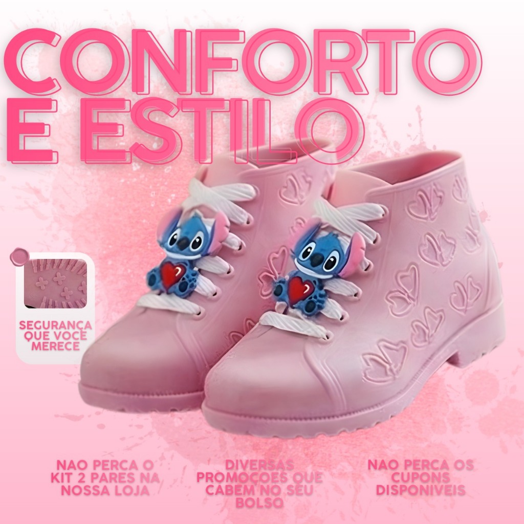A Botinha Infantil Feminina com Stitch une conforto, segurança e um visual encantador que as crianças adoram. Ideal para escola, passeios e uso diário, esse modelo traz um toque divertido sem abrir mão da praticidade. Conta com solado antiderrapante, oferecendo mais firmeza ao caminhar, e um interior macio que garante conforto durante todo o dia. O cano curto facilita o calce e proporciona melhor ajuste aos pés infantis. Características do produto: Modelo: Botinha Infantil Feminina com Stitch Estilo: Casual / Dia a dia Cano curto Solado antiderrapante Confortável e leve Design divertido com Stitch Numeração disponível: ✔ 26/27 ao 32/33 Uma opção charmosa e confortável para deixar o dia a dia das crianças ainda mais divertido.