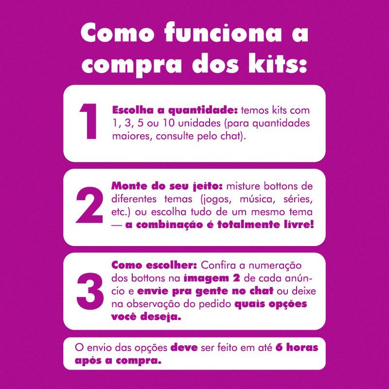 Como funciona a compra de kits? 1️⃣ Escolha a quantidade: Unitário, kit com 3, 5 ou 10 bottons. 2️⃣ Misture como preferir: Combine bottons de um mesmo tema ou misture com outros temas (jogos, música, séries, etc.). 3️⃣ Envie a numeração ou prints dos bottons escolhidos no campo de mensagens ou pelo chat após a compra. 📩 Ficou com alguma dúvida ou não encontrou o botton que queria? Chame a gente no chat! 😊 📌 Lembrete: aguardamos até 6h pela sua resposta. Caso não haja retorno, enviaremos modelos aleatórios dentro do tema escolhido. Tags: bottons personalizados, kit bottons, bottons geek, bottons colecionáveis, bottons para mochila, bottons para jaqueta, bottons anime, bottons cultura pop, bottons Mundo Torajo, Mundo Torajo, Animação, bottons Animação