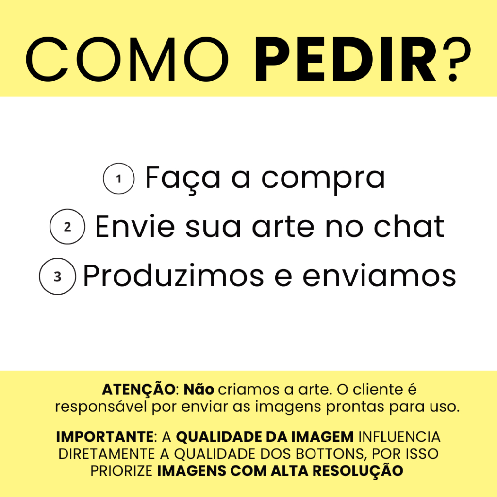 | Bottons/Botons/Buttons/Broches/Pin Redondo PERSONALIZADO 4,5 cm este produto | R$ 10,00 | — | 5.0/5 | — |