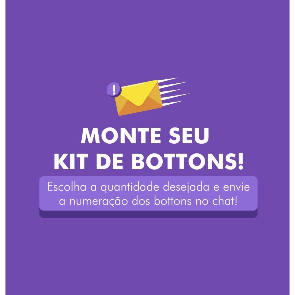Como funciona a compra de kits? 1️⃣ Escolha a quantidade: Unitário, kit com 3, 5 ou 10 bottons. 2️⃣ Misture como preferir: Combine bottons de um mesmo tema ou misture com outros temas (jogos, música, séries, etc.). 3️⃣ Envie a numeração ou prints dos bottons escolhidos no campo de mensagens ou pelo chat após a compra. 📩 Ficou com alguma dúvida ou não encontrou o botton que queria? Chame a gente no chat! 😊 Tags: bottons personalizados, kit bottons, bottons geek, bottons colecionáveis, bottons para mochila, bottons para jaqueta, bottons anime, bottons cultura pop, bottons Billie Eillish, Billie Eillish, Música, bottons Música
