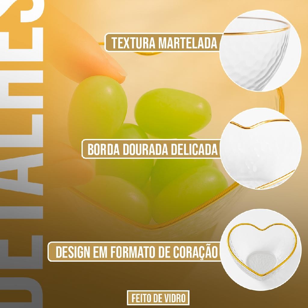 Bowl de Vidro Coração com Borda Dourada – Tigela Pequena 9cm Textura Martelada para Sobremesas, Petiscos e Decoração Quer dar mais charme e sofisticação à sua mesa? O Bowl de Vidro em Formato de Coração com Borda Dourada é a peça ideal para quem valoriza detalhes que encantam. Seja para servir sobremesas, petiscos ou até para decorar ambientes, ele transforma momentos simples em ocasiões especiais. Fabricado em vidro de alta qualidade, esse potinho possui textura martelada delicada que proporciona um toque artesanal e elegante. Seu design em formato de coração transmite carinho e acolhimento, tornando-o perfeito para recepções, cafés da tarde, jantares românticos e encontros em família. A borda dourada dá um acabamento sofisticado e moderno, elevando a experiência de servir e destacando ainda mais o conteúdo. Imagine oferecer morangos com chocolate em um jantar especial, mousses bem apresentados após a refeição ou até sorvetes em uma taça diferenciada. Além disso, o bowl também pode ser usado para servir castanhas, uvas, frutinhas ou até organizar ingredientes na cozinha de forma charmosa e funcional. Esse bowl é mais do que uma tigela – é uma peça versátil que une beleza, praticidade e estilo. Ele pode ser usado tanto no dia a dia quanto em ocasiões especiais. Além de funcional, também é um ótimo item de decoração: coloque pérolas, velas ou flores secas e crie um arranjo delicado para sua sala ou quarto. Com dimensões compactas (9 cm x 7 cm x 5 cm), é fácil de armazenar e pode ser combinado com outros bowls para formar um conjunto incrível. Garanta já o seu Bowl de Vidro Coração com Borda Dourada e leve para sua casa mais sofisticação e elegância! Clique em comprar agora e transforme sua mesa em um verdadeiro espetáculo de charme. Benefícios e Diferenciais Design exclusivo em formato de coração – transmite carinho e sofisticação Borda dourada delicada – acabamento moderno e elegante Vidro de alta qualidade – resistente, higiênico e fácil de limpar Textura martelada – charme extra e toque artesanal Versátil – ideal para sobremesas, petiscos, ingredientes e decoração Compacto e funcional – perfeito para o dia a dia ou ocasiões especiais Medidas Aproximadas Largura: 9 cm Profundidade: 7 cm Altura: 5 cm Palavras-chave para SEO bowl coração vidro, potinho coração vidro, tigela vidro pequena, bowl sobremesa vidro dourado, potinho decorativo vidro, tigela coração sobremesa, bowl petiscos vidro, mini bowl cozinha
