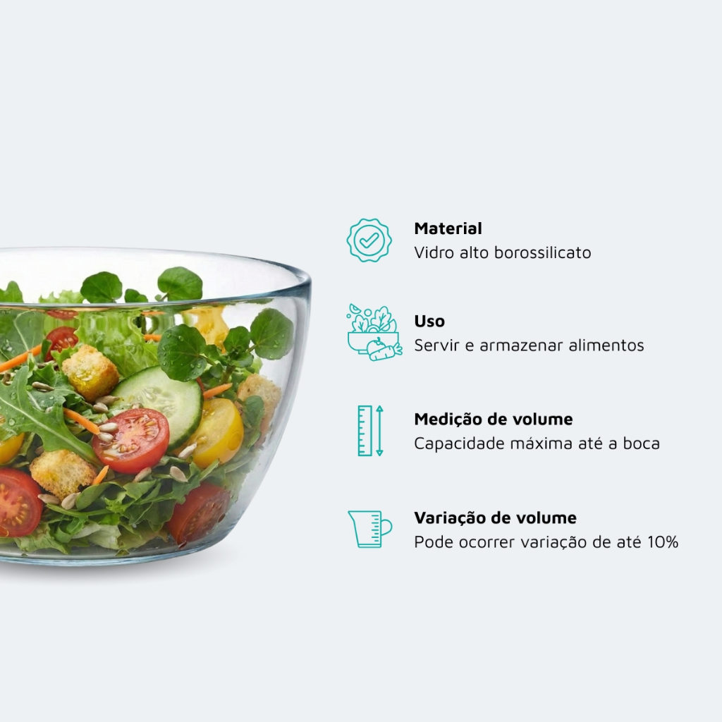 Bowl Vidro Grande Tropical Saladeira Tigela Servir Mesa Posta Cozinha 4750ml Ruvolo Servir grandes porções de saladas ou frutas em recipientes pequenos compromete a apresentação e dificulta o manuseio dos alimentos. O Bowl de Vidro Tropical Tamanho G da Ruvolo resolve este problema com uma ampla capacidade de 4750ml, permitindo misturar e servir volumes generosos com facilidade, garantindo elegância e praticidade para sua mesa. Benefícios Principais Este bowl destaca-se pela sua capacidade superior (4,75 litros), ideal para famílias grandes ou eventos. Fabricado em vidro de alta qualidade, oferece resistência e higiene total, não retendo odores ou manchas de molhos e temperos. O design da linha Tropical combina sofisticação com funcionalidade, sendo uma peça robusta que valoriza a estética dos alimentos servidos através de sua transparência cristalina. A limpeza é facilitada pela superfície lisa do vidro. Compatibilidade e Aplicação Produto indicado para servir grandes porções. Aplicação ideal como saladeira, fruteira de mesa, recipiente para massas, sobremesas em grande quantidade ou ponche. Perfeito para uso diário em cozinhas residenciais ou para compor a mesa em ocasiões especiais. A higienização deve ser manual com esponja macia, evitando abrasivos e choques térmicos (mudanças bruscas de temperatura). Especificações Técnicas • Produto: Bowl / Saladeira • Linha: Tropical • Tamanho: G (Grande) • Material: Vidro • Capacidade: 4750ml (4,75 Litros) - Volume máximo até a boca • Variação Volumétrica: Pode sofrer variação de até 10% do volume nominal • Referência de Medida: Diâmetro medido pela largura maior da peça Itens Inclusos 1 Bowl de Vidro Tropical Tamanho G 4750ml Ruvolo. Transforme a apresentação das suas refeições com a capacidade e beleza da linha Tropical. Adquira agora o Bowl Gigante Ruvolo e sirva com abundância e estilo. Ruvolo A Ruvolo é uma empresa especializada na produção de copos, taças, canecas e outros produtos de utilidade doméstica em vidro e cristal, oferecendo itens funcionais, resistentes e com design pensado para o uso diário. Trabalha com produtos voltados para praticidade, organização e apresentação, atendendo tanto o uso doméstico quanto opções para presente, sempre com foco em qualidade e bom acabamento. Há mais de 100 anos no mercado, a Ruvolo traz excelência e qualidade para a sua mesa. Pensou em vidro, pensou em Ruvolo.