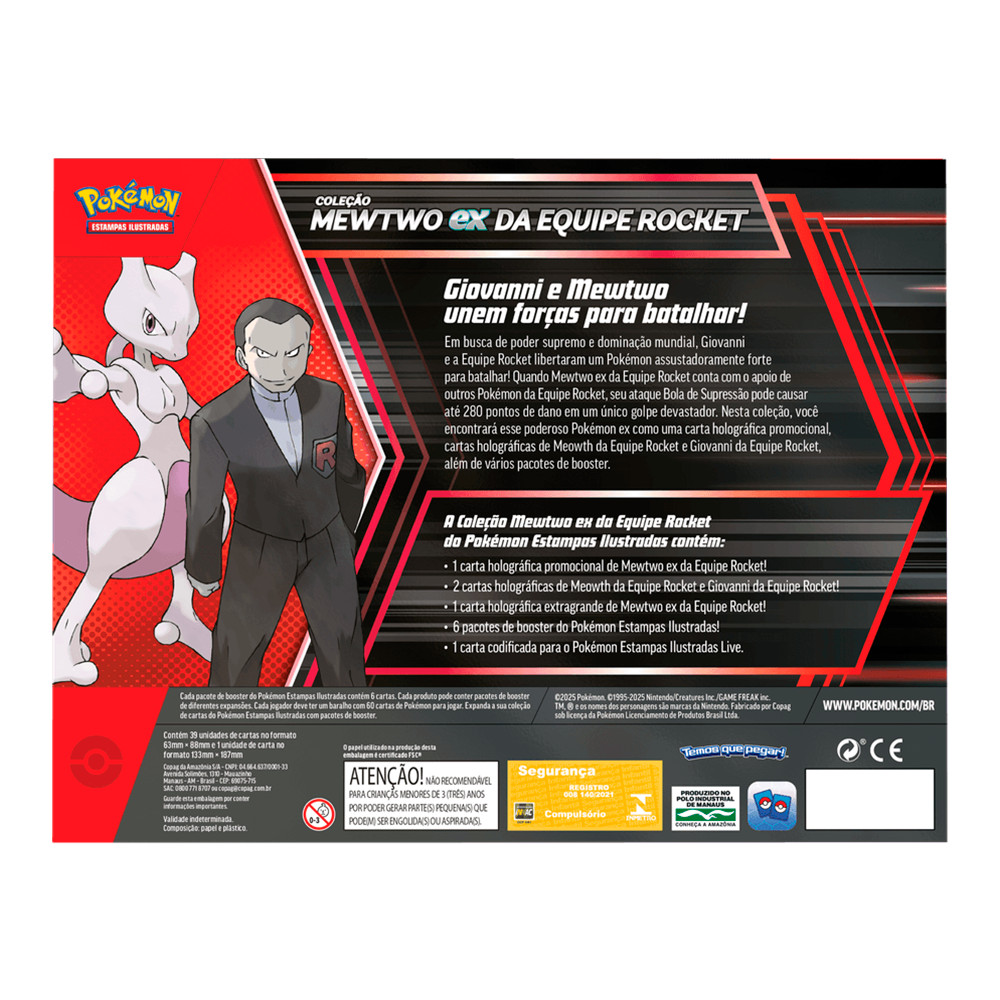 INFORMAÇÕES SOBRE O PRODUTO GIOVANNI E MEWTWO UNEM FORÇAS PARA BATALHAR! Em busca de poder supremo e dominação mundial, Giovanni e a Equipe Rocket libertaram um Pokémon assustadoramente forte para batalhar! Quando Mewtwo ex da Equipe Rocket conta com o apoio de outros Pokémon da Equipe Rocket, seu ataque Bola de Supressão pode causar até 280 pontos de dano em um único golpe devastador. Nesta coleção, você encontrará esse poderoso pokémon ex como uma carta holográfica promocional, cartas holográficas de Meowth da Equipe Rocket e Giovanni da Equipe Rocket, além de vários pacotes de booster. A Coleção Mewtwo ex da Equipe Rocket do Pokémon Estampas Ilustradas Contém: - 1 Carta holográfica promocional de Mewtwo ex da Equipe Rocket! - 2 Cartas holográficas de Mewtwo ex da Equipe Rocket e Giovanni da Equipe Rocket! - 1 Carta holográfica extragrande de Mewtwo ex da Equipe Rocket! - 6 Pacotes de booster do Pokémon Estampas Ilustradas! - 1 Carta codificada para o Pokémon Estampas Ilustradas Live. Características: - Marca: The Pokémon Company. - Produto em Português. - Idade Recomendada: +3 anos. Conteúdo da embalagem: - 39 unidades de cartas no formato 63mm x 88mm - 1 unidade de carta no formato 133mm x 187mm *Não indicado para menores de 3 anos. Imagens Meramente Ilustrativas. Todas as Informações divulgadas são de responsabilidade do Fabricante/Fornecedor. Verifique com os fabricantes do produto e de seus componentes eventuais limitações à utilização de todos os recursos e funcionalidades. *Garantia de 30 dias contra defeitos de fabricação não decorrentes de mal uso (mediante aprovação da fabricante).