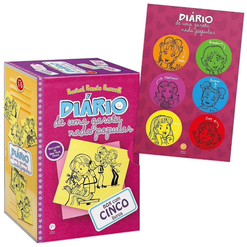 Pela primeira vez em edição de bolso, você pode colecionar os cinco primeiros diários de Nikki reunidos em uma caixa. A série que já conquistou milhares de meninas (e meninos também!) Pelo Brasil, com mais de 1,7 milhão de exemplares vendidos, agora em formato reduzido e mais leve para você levar sua leitura para onde você for. Se aventure com essa vida escolar nada fácil e deixe o seu lado nada popular brilhar ainda mais! Acompanha uma cartela exclusivas com 6 adesivos dos personagens para você decorar seu caderno ou o seu próprio diário. Diário de uma garota nada popular 1 (288 págs) Nikki, de 14 anos, ganhou uma bolsa de estudos para uma escola particular de prestígio. Sua angústia ao lidar com as meninas malvadas do colégio, a relação com seus pais, sua paixão pelo bonitão da escola e as novas amizades que faz são assuntos registrados em seu diário, ao lado de inúmeros desenhos que ela mesma faz de sua vida.   Diário de uma garota nada popular 2 (288 págs) Já mais adaptada à nova escola, Nikki vê sua vida melhorar ao ser convidada para ser parceira de laboratório de Brendon Roberts, sua paixão secreta. A proximidade faz a adolescente sonhar em ser convidada por ele para ir ao baile de fim de ano da escola. Mas sua principal rival, a detestável MacKenzie, vai fazer de tudo para impedir que isso aconteça.   Diário de uma garota nada popular 3 (320 págs) Após superar o período de adaptação no novo colégio e conseguir ir à festa de Halloween com o menino de seus sonhos (Brandon) - mesmo que só como amiga -, Nikki Maxwel tem um novo problema para resolver: Evitar que todos saibam que seu pai trabalha como dedetizador da escola em troca de sua bolsa de estudos. Em Diário de uma garota nada popular: Histórias de uma pop star nem um pouco talentosa, Nikki teme pela própria reputação e decide participar de um concurso de calouros cujo prêmio é uma bolsa escolar. A partir daí, a protagonista bola um plano perfeito.   Diário de uma garota nada popular 4 (368 págs) Nikki Maxwell não ficou totalmente surpresa ao descobrir que sua paixão, Brandon, trabalha como voluntário em um abrigo de animais, pois ele é tão doce que seria mesmo capaz de ajudar aqueles filhotinhos adoráveis! Mas Brandon diz a ela que o abrigo está correndo o risco de fechar, e Nikki sabe que não pode deixar isso acontecer – especialmente após descobrir um segredo chocante sobre Brandon. Então Nikki e suas amigas, Chloe e Zoey, entram numa competição de patinação no gelo para ajudar a levantar recursos para o abrigo, mas Mackenzie, para variar, vai se intrometer e causar problemas no intuito de se passar por solucionadora de todos os problemas. E Nikki terá que pensar em ideias mais criativas desta vez para não deixar isso acontecer de jeito nenhum!   Diário de uma garota nada popular 5 (336 págs) Nikki Maxwell passa a se interessar por jornalismo quando Mackenzie começa a escrever uma coluna de fofocas, onde relata informações sobre sua paixão, Brandon, as quais Nikki não queria que fossem divulgadas. Então Nikki se junta a equipe do jornal da escola e acaba escrevendo uma coluna de conselhos! No início é divertido, ao responder cartas de outras crianças. Mas quando sua caixa de correspondência fica repleta de pedidos de orientações, Nikki passa a precisar de ajuda. Felizmente ela tem suas melhores amigas Chloe e Zoey ao seu lado — e em seu teclado também!