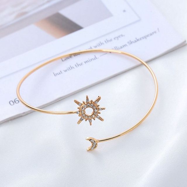 Braçadeira de metal com diamantes e sol e lua, atacado, joias da Amazon, ajustável, temperamento simples, para mulheres