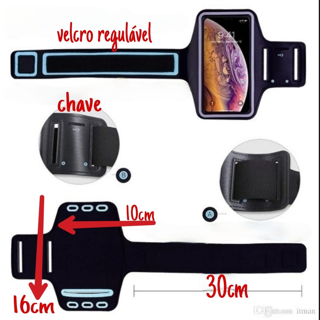 Suporte de Braço para Celular para Atividades Físicas Proporciona à você segurança e conforto para levar o seu celular ao correr, malhar e se exercitar. Além do visual bonito, é prática e oferece a proteção que seu smartphone precisa. Segurança em primeiro lugar: Com a Braçadeira você consegue realizar tanto as tarefas do dia a dia, quanto se exercitar como quiser, transportando sempre o seu smartphone protegido com você. Mini Bolso para chave: Fita refletiva discreta para noite Entrada para fone: Braçadeira é feita em neoprene, poliéster e polietileno Seu material é resistente permite a você atender a ligações e usar o touch da tela sem precisar retirar o aparelho do bolso protetor da capa. Para celulares de 6.4 POLEGADAS Medidas Aproximadas ALTURA-17 CM LARGURA-8.5 CM