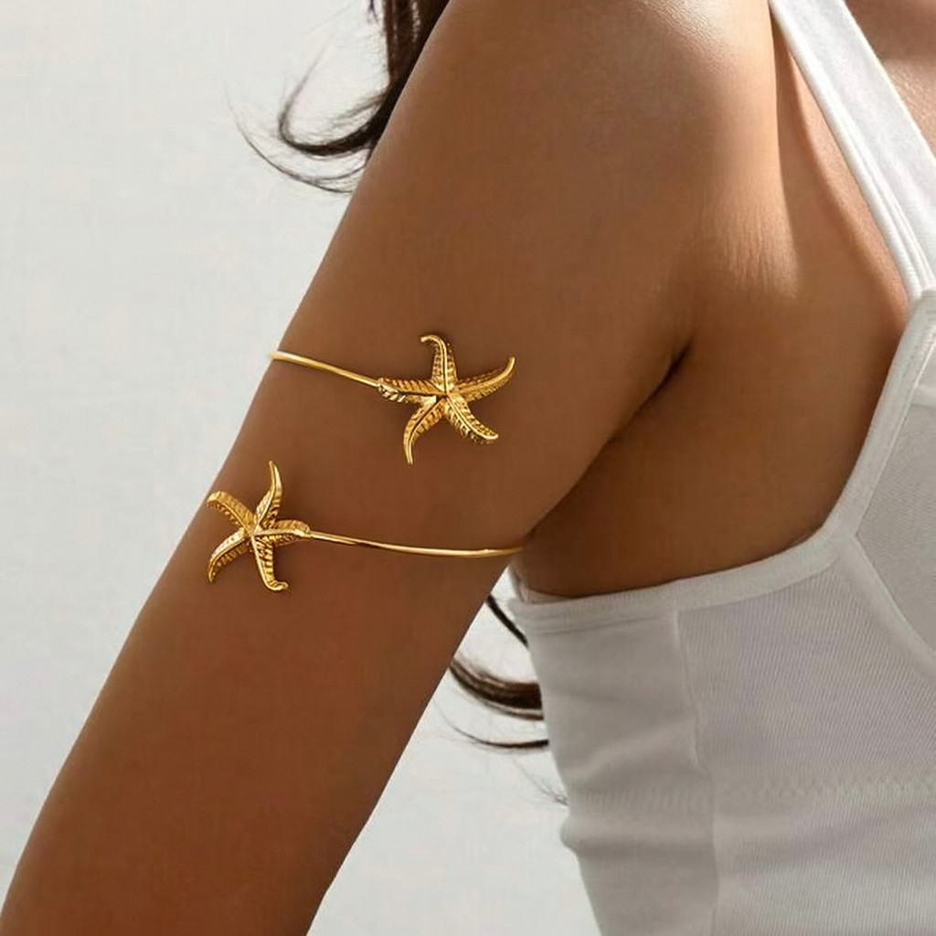 Bracelete de Braço Feminino Ajustável Estilo Praia com Conchas, Estrela-do-Mar, Banhado em Ouro 18K e Prata 925