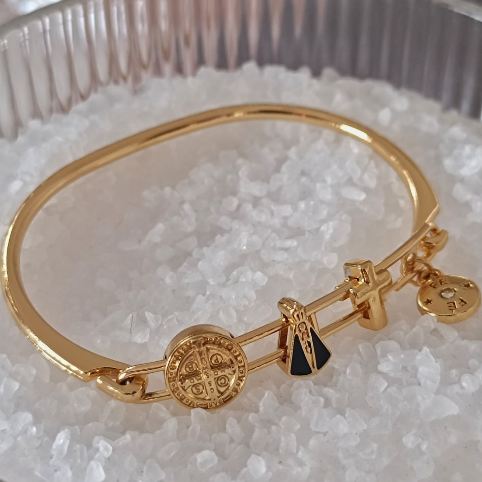 "Este elegante bracelete é perfeito para quem deseja carregar símbolos de fé e proteção no dia a dia. Produzido em zamak com banho de ouro e acabamento em verniz italiano, ele combina beleza e durabilidade. Os delicados pingentes incluem a medalha de São Bento, Nossa Senhora Aparecida, uma cruz e o símbolo da fé com um cristal, refletindo espiritualidade e sofisticação. É ideal para quem busca um acessório marcante e cheio de significado." Tamanho Único INDICADO PARA PULSO 14CM ATÉ 17CM Composição: Metal Zamak com Verniz Italiano Acabamento : Ouro e Níquel O ZAMAK é uma liga metálica composta principalmente de zinco, com pequenas adições de alumínio, magnésio e cobre. O nome "ZAMAK" é um acrônimo derivado dos elementos principais da liga em alemão: Zink (zinco), Aluminium (alumínio), Magnesium (magnésio) e Kupfer (cobre). O metal ZAMAK é conhecido por sua excelente capacidade de fundição, durabilidade, resistência à corrosão. Cuidados com os produtos: Para que sua peça tenha uma durabilidade maior recomendamos alguns cuidados com o uso e manuseio: - evitar contato com produtos de higiene e limpeza - retirar antes do banho - evitar contato com cloro e água salgada - armazenar as peças separadamente das demais