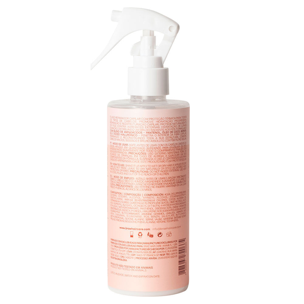 Brae Essential Hair Repair Spray 260ml 2 Unidades ESSENTIAL para todas. Braé apresenta o fluido finalizador reparador ESSENTIAL, para a sua rotina de hair care se tornar ainda mais possível, prática e versátil. Fluído finalizador reparador com proteção térmica, para todos os tipos de cabelos. Um único produto que repara, hidrata, protege, reconstrói e proporciona brilho intenso a fibra capilar. Pode ser utilizado como finalizador ou tratamento reparador. Ação Formulado com Ácido Hialurônico, Monoi oil, Blend de Aminoácidos, Pantenol e Óleo de Coco. Através de suas propriedades reparadoras, hidratantes e protetoras, proporciona cabelos mais macios, sedosos, fortalecidos, cores mais duradouras e com brilho absoluto. Contém filtro solar para proteção dos danos causados pelo sol e proteção térmica contra danos causados pela uso constante de ferramentas térmicas. Livre de parabenos. Conselho de aplicação Agite antes de usar. Com os cabelos úmidos ou secos, aplique no comprimento e pontas uma quantidade suficiente para envolver os fios, penteie e massageie suavemente proporcionando melhor espalhabilidade nos cabelos. Finalize com secador/prancha criando o seu style favorito. Utilize Braé Essential como tratamento reparador. Nos cabelos limpos e úmidos após o uso do shampoo Braé da sua escolha, aplique por todo o cabelo o seu Braé Essential, deixe agir entre 5 a 10 minutos e enxague totalmente o produto, após finalize com o condicionador Braé da sua escolha, tornando a sua higienização diária com Braé uma experiência ainda mais incrível. RESULTADO: FIOS EXTREMAMENTE HIDRATADOS, FORTALECIDOS E COM BRILHO INTENSO.