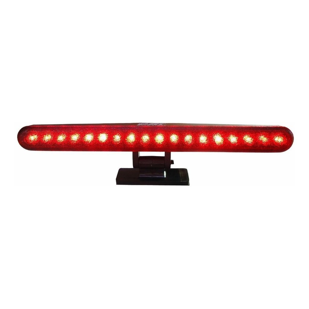 ‘- Brake Light ; – Tensão de Funcionamento: 12V; – Corrente Máx.: 100mA; – Iluminação:18 LEDs; – Lente Vermelha; – Suporte Ajustável conforme inclinação do vidro; – Aplicação: 3ª ( Terceira ) Luz Auxiliar de Freio com função de Lanterna traseira de neblina; – Funcionamento: Ficará com os 6 LEDs centrais acesos quando ligada a Luz de Neblina e acenderá os demais ( Total de 18 ) LEDs quando acionados os freios; – Universal: Carros, Pick-ups, Vans, etc.; – Comprimento Aproximado do Chicote: 1,40m; – Dimensões Aproximadas: 21 x 4,5cm.