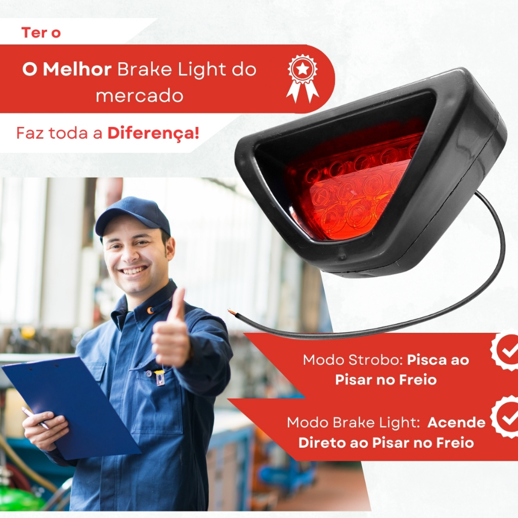 O Break Light triangular é um item que aumenta a sua segurança no trânsito porque ele funciona perfeitamente como terceira luz de freio, Luz anti neblina Design modelo tuning Serve para adaptar em qualquer veiculo sendo de voltagem 12v Carros Motos Triciclos Caminhões Pode-se instalar tanto na parte interna quanto externa do veiculo Produto a prova d'agua Alta potência com 12 leds Possui alta visualização noturna, potência de 12V e dois modos de instalação, tradicional e strobo (pisca) Corpo preto com lente Vermelha Acompanha kit de instalação (suporte e parafusos para fixar) Produto novo de excelente qualidade!