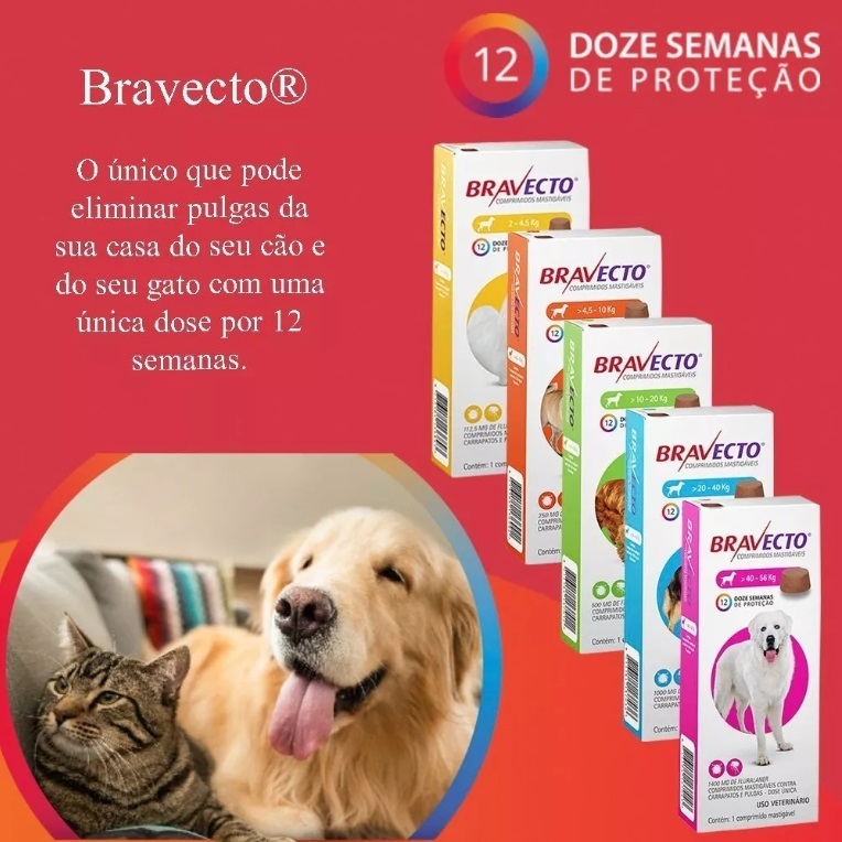 PRODUTO A PRONTA ENTREGA, 100% ORIGINAL, NA CAIXA. 1 Comprimido para Cães de 20 a 40 kg Bravecto® é o único que pode eliminar carrapatos e pulgas da sua casa e do seu pet com uma única dose, por 12 semanas. FÓRMULA: Cada 1 g do produto contém: Fluralaner …………………………………………………..136,4 mg Excipientes q.s.p. …………………………………………….1,0 g INDICAÇÕES: Para o tratamento de infestações por carrapatos e pulgas, em cães, proporcionando 12 semanas de proteção. Esse produto veterinário é um inseticida e acaricida sistêmico com longa duração de ação que promove eficácia imediata e persistente por 12 semanas contra carrapatos (formas adultas e jovens de Ixodes ricinus, Ixodes hexagonus, Ixodes scapularis, Ixodes holocyclus, Dermacentor reticulatus, Dermacentor variabilis e Rhipicephalus sanguineus) e pulgas (Ctenocephalides felis e Ctenocephalides canis). Pulgas e carrapatos devem estar aderidos ao cão e iniciar a alimentação para serem expostos ao princípio ativo. O início da ação é dentro de 8 horas para pulgas e 12 horas para carrapatos. O produto controla eficazmente as populações de pulgas no ambiente, nas áreas às quais o cão tem acesso. O produto pode ser utilizado como parte de uma estratégia de tratamento para a dermatite alérgica à picada de pulgas.
