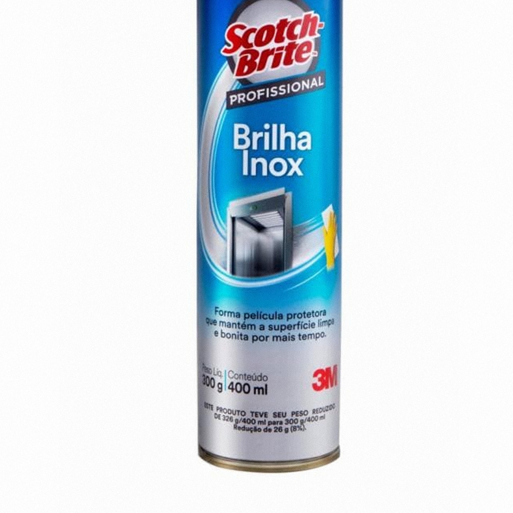 Brilha Inox Scotch-Brite 400 ml Descrição: - Própria para todos os mercados institucionais: condomínios, edifícios comerciais, centros empresariais, food service (cozinhas industriais, restaurantes, bares, padarias, fast food e industrias de alimentos), hotéis, hospitais, transportes, bancos, shopping center, etc. Informações Gerais: - Limpa e protege a superfície onde e aplicado; - Indicado para aço inox, alumínio, pecas cromadas, objetos esmaltados, pecas de cerâmica e madeira envernizada; - Forma uma película entre a superfície e o ambiente, evitando a oxidação das pecas e facilitando sua limpeza e manutenção; - Não deixa película gordurosa na superfície, evitando manchas em roupas; - Alto rendimento; - Da brilho; - Pratico e facil de usar. Aplicações: - Superfícies de aço inox; - Superfícies de alumínio; - Pecas cromadas. Especificações Técnicas: - Tipo: Spray; - Conteúdo: 400 ml / 300 g. Itens Inclusos: - 1 Brilha inox - 400 ml.