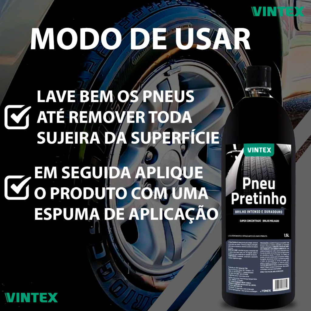 O Pneu Pretinho é um produto que foi especialmente desenvolvido para proteger, conservar e dar brilho aos pneus em geral. Promove proteção prolongada, brilho intenso e duradouro que deixa os pneus com as pecto de novos. -Brilho molhado -Super concentrado Modo de usar 1. Lave bem os pneus removendo toda a sujeira como lama, barro, etc; 2. Em seguida, aplique o produto puro com o auxílio do Aplicador de Espuma. - Não nos responsabilizamos pela má instalação ou mau uso do produto, faça a instalação com profissionais especializados. - Atenção: As compras realizadas em nome de Pessoa Jurídica estão sujeitas a cobrança de ICMS, conforme Protocolo ICMS 41, de 4 de Abril de 2008. Caso você tenha dúvidas sobre o percentual a ser aplicado, consulte a Cláusula Segunda, §1° do referido Protocolo. - Em caso de dúvidas use o campo de Perguntas. Fotos meramente Ilustrativas. Caso tenha dúvidas quanto a utilização deste produto, favor consulte-nos pelo campo de perguntas. CÓD. REFERÊNCIA: 015294