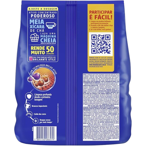 Brilhante Lava-Roupas Em Pó Roupas Brancas E Coloridas Limpeza Total Pacote Tamanho Família 4 Kg O Sabão em Pó Brilhante Limpeza Total permite a blindagem das cores, deixando-as muito mais vivas e impactantes Este detergente lava roupas em pó para tecidos e roupas possui a tecnologia Brilho Ativo, mantendo o colorido das roupas por muito mais tempo Este lava-roupas em pó evita o amarelamento dos tecidos, deixando os brancos impecáveis Brilhante Limpeza Total, com sua nova fórmula que além de higienizar suas roupas profundamente, as protege cuidando das cores O Sabão em Pó Brilhante ajuda a prevenir sinais de desgaste, mantendo suas roupas novas por mais tempo* Este detergente garante uma limpeza profunda desde a primeira lavagem A nova fórmula do Sabão em Pó Brilhante Limpeza Total combina os melhores resultados de limpeza com o cuidado dos tecidos: de um lado, o poder das enzimas, que proporciona uma limpeza profunda ao mesmo tempo que evita que a sujeira volte a se depositar nas roupas; do outro, a tecnologia Brilho Ativo que evita o amarelamento das roupas brancas e mantém os coloridos mais vivos. O Lava-Roupas em Pó Brilhante Limpeza Total limpa profundamente suas roupas sem agredir os tecidos, ajudando a prevenir os sinais de desgaste das suas peças preferidas após cada lavagem, além de permitir a blindagem das cores, deixando-as muito mais vivas e impactantes. Entre limpeza profunda e blindagem da cor? Escolha os dois! Com Brilhante, você sempre leva mais com a solução completa! Brilhante limpa as suas roupas brancas e coloridas enquanto cuida das cores. É um ativo concentrado poderoso. Brilhante quer se tornar um aliado nas tarefas diárias de seus consumidores e busca trazer praticidade com produtos inovadores e que todo mundo possa usar, diminuindo o peso das tarefas e liberando tempo para as demais atividades do dia a dia. Acesse o nosso website para saber mais. *Comparado à fórmula sem tecnologia de enzimas.