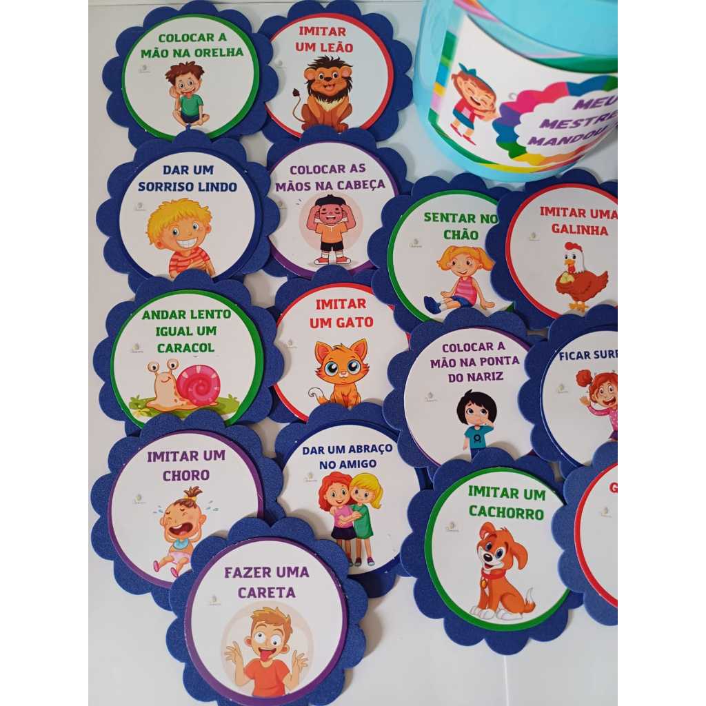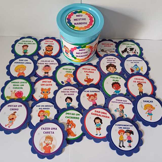 As cores das fichas e do pote poderão variar de acordo com o material disponível. O Pote Lata Meu Mestre Mandou contém 23 fichas com sugestões de Comandos feito por um "Mestre". A brincadeira é um jogo simples e divertido que estimula a atenção, a concentração, a coordenação motora, a escuta e a criatividade das crianças. Um adulto ou uma criança se torna o "mestre" e dá comandos que só devem ser obedecidos se começarem com a frase "Seu Mestre Mandou!", eliminando quem errar ou obedecer sem o comando correto. Podendo ser utilizado na aula de Educação Física, aulas de dança, Movimento ou Cultura Corporal na Educação Infantil e séries iniciais. Uma dinâmica muito divertida, as crianças vão amar! As fichas são impressas na gráfica, no papel couche 250 gr (tipo papel fotográfico grosso), impressão digital, de excelente qualidade, resistente à agua. As fichas são coladas em escalopes em formato de flores que são feitos de Eva (marca Make Mais), para uma maior durabilidade e melhor acabamento nas fichas de Movimento. Cada escalope mede 9,6cm de diâmetro. Esse pote é uma opção feita de plástico, mais compacta e com maior durabilidade. Medindo 13cm de altura e 10cm de diâmetro.