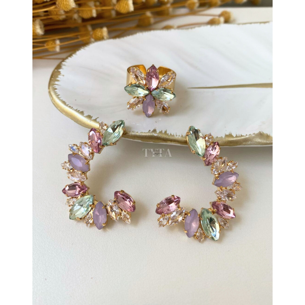 Brinco, anel e choker em zircônia com banho de ouro brinco rosa brinco lilás brinco menta serena choker zirconia