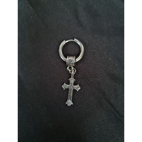Brinco Masculino Argola prata Preto Black em aço inox clicker cruz crucifixo Vazado romana coreano