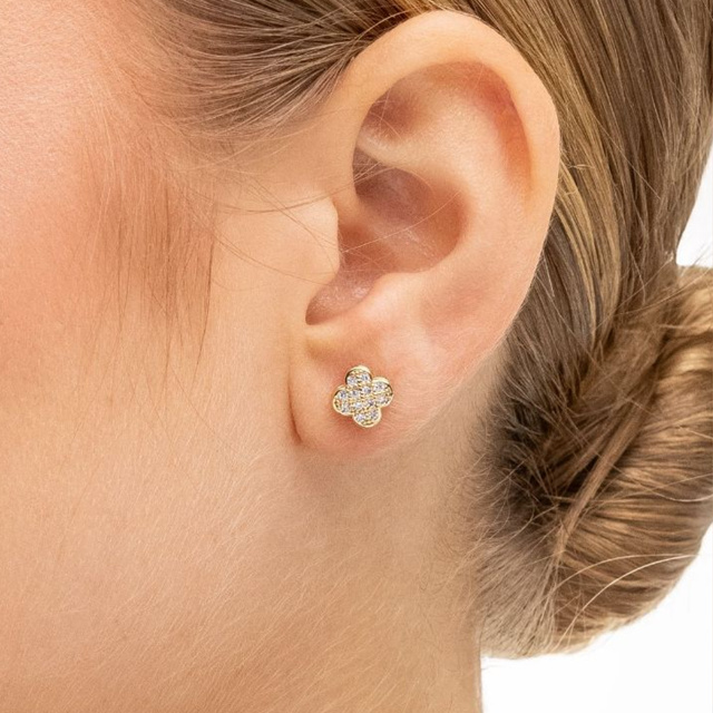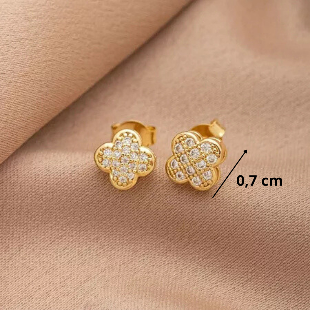 Brinco Trevo Dourado Feminino Pequeno Cravejado Banhado a Ouro 18k Brincos Mania de Madame