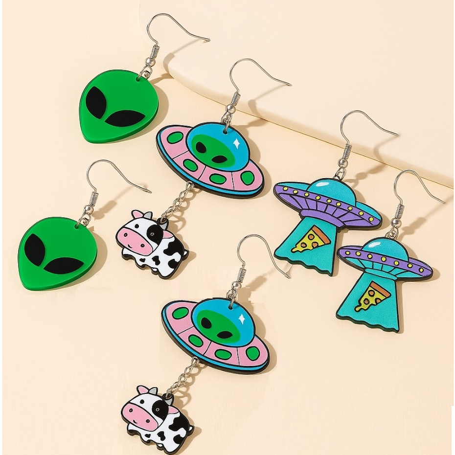 Brincos Aesthetic Alien Et – UFO, Pizza & Vaquinha Galaxia Pop em Acrílico