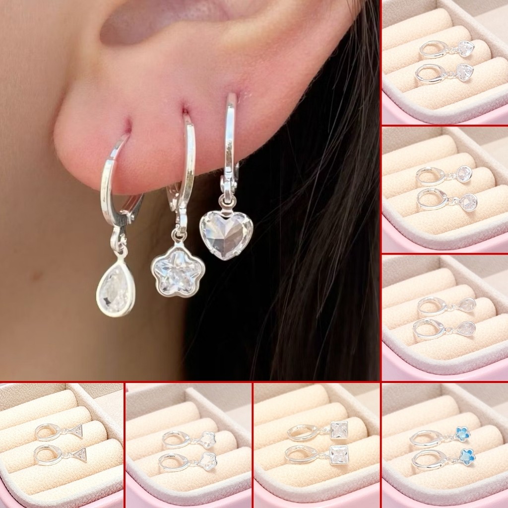 Brincos de prata 925 com pingentes em formato de coração, lágrima, redondo, flor, quadrado e triângulo