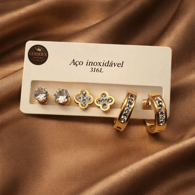 Brincos femininos em Aço Inox 316L, disponíveis nas cores prata e dourado, ideais para quem busca elegância e versatilidade no dia a dia. O conjunto combina modelos delicados com argolas modernas cravejadas em zircônia, criando um visual sofisticado e fácil de combinar. Perfeito para quem procura: • brinco argola aço inox 316L • brinco feminino com zircônia • brinco prata moderno • brinco dourado elegante • brinco delicado para segundo furo • brinco feminino aço inox antialérgico Design contemporâneo que funciona tanto para uso diário quanto para ocasiões especiais. Especificações • Material: Aço Inox 316L • Cores disponíveis: Prata ou Dourado • Pedra: Zircônia • Quantidade: 3 pares • Estilo: Moderno e delicado Versátil, elegante e fácil de combinar. GuBijoux — brilho na medida certa. ✨