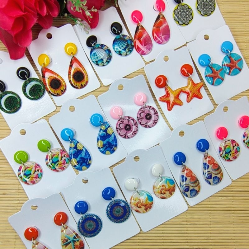 São 6 pares de brincos em 6 cores sem repetição! Medida: 6cm Material: resina colorida com estampa Pino: de metal com tarraxa de silicone Conteúdo: 6 pares de brincos Obs: não é antialérgico Nossa equipe da Art Laser Bijuterias agradece pela sua compra 💚 Se tiver alguma dúvida entre em contato conosco pelo chat 🗨️