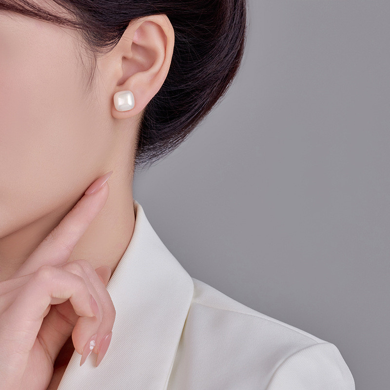 Brincos Femininos Pequenos de Pérola Quadrada, Prata 925 Anti-alérgico, Delicados e Elegantes para Uso Diário