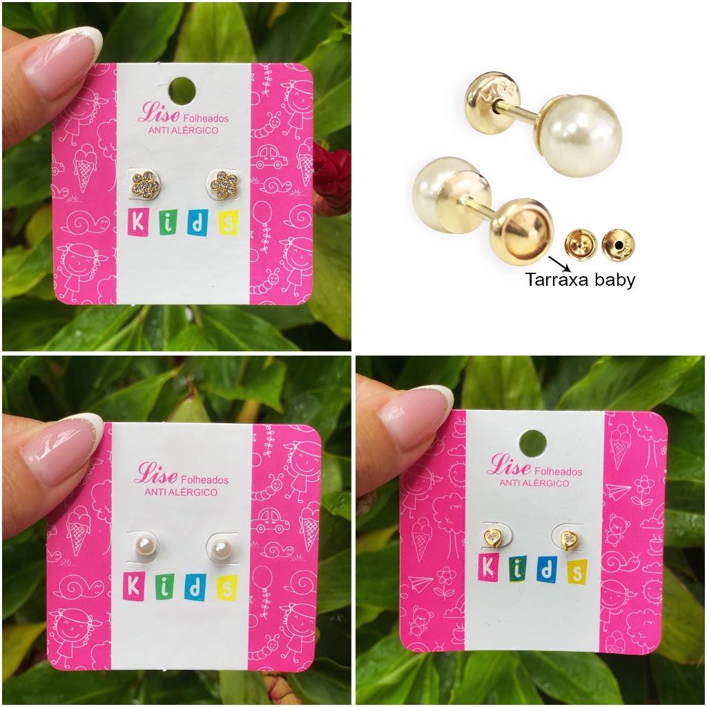 | Brincos Folheados a Ouro Infantil Com Tarraxa Baby Para Crianças 1 Par este produto | R$ 12,50 | 11% | 4.7/5 | 4 |