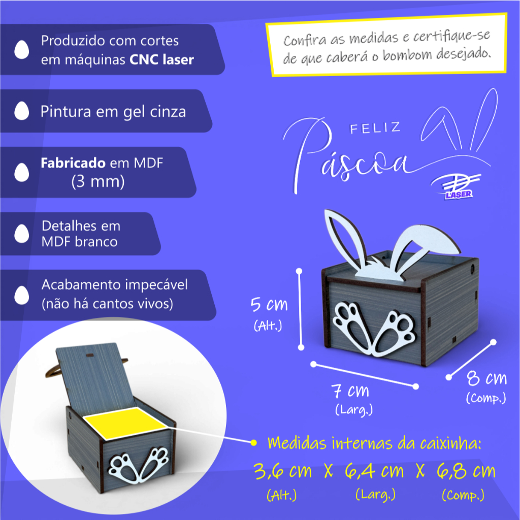 Uma lembrancinha criativa, econômica e super versátil para montar kits de Páscoa! O Kit de Caixinhas Porta Bombom Coelho é perfeito para presentear clientes, alunos, colaboradores e família com um toque artesanal e encantador. O design lúdico, com orelhas e patinhas em MDF branco, entrega aquele visual fofo e temático que valoriza qualquer lembrança — basta colocar o bombom e pronto! DESTAQUES DO PRODUTO: - Design exclusivo: tampinha com orelhas de coelho e patinhas aplicadas na frente (efeito 3D). - Ideal para kits: perfeito para montar lembrancinhas e brindes de Páscoa (escola, empresa, eventos). - Acabamento premium: MDF com textura cinza e detalhes em MDF branco. - Durável e reutilizável: depois da Páscoa pode virar porta trecos/organizador. - Produto enviado montado (montagem artesanal). - * - Não acompanha doces. Envio apenas das caixinhas (conforme variação escolhida). COMO USAR: Coloque o bombom/ovinho desejado, criando uma lembrancinha personalizada. Antes de comprar, confira as medidas internas para garantir que o doce escolhido irá caber. FICHA TÉCNICA: - Tema: Páscoa / Coelho / Feliz Páscoa. - Tipo: Caixinha porta bombom / lembrancinha / organizador. - Estilo: Cartoon, moderno e lúdico. - Capacidade (base Ouro Branco/Sonho de Valsa): 02 bombons caixinha semiaberta / 01 bombom caixinha fechada. - Material: MDF 3 mm. - Cor/Acabamento: cinza texturizado (base) com detalhes em MDF branco (orelhas e patinhas). - Produção: cortes em máquina CNC laser (alta precisão). - Montagem: produto enviado montado (montagem artesanal). Apenas as orelhas vão desmontadas na embalagem para proteger no transporte e facilitar o envio. - Uso: presente + lembrancinha + kit corporativo + escolar + decoração. MEDIDAS: - Caixinha (sem orelhas): 5 cm (A) X 7 cm (L) X 8 cm (C). - Medidas internas da caixinha: 3,6 cm (A) X 6,4 cm (L) X 6,8 cm (C). - Caixinha com orelhas: 8,5 cm (A) X 8,8 cm (L) X 8 cm (C). CONTEÚDO DA EMBALAGEM: - 30 caixinhas temática coelho da Páscoa. OBSERVAÇÕES: a) A tonalidade do produto pode variar de acordo com a resolução da tela. b) Os objetos que ambientam as fotos não acompanham o produto. c) Cuidados especiais: não deixar em contato direto com a água; limpar somente com um pano levemente umedecido. d) Caso tenha algum problema após a sua compra, conte com a nossa equipe de pós-venda para solucionar com a maior agilidade. e) Utilizamos o emissor de Nota Fiscal automático da plataforma, portanto não temos como alterar nenhum dado. Tanto a nota fiscal como a etiqueta de envio serão conforme as informações cadastradas e confirmadas pelo comprador no momento da compra. f) Não é emitida nota fiscal para terceiros. g) Todas as fotos são de produtos reais e de exclusividade da DF LASER; o uso não autorizado das imagens poderá acarretar punições de acordo com a lei de direitos autorais. GARANTIA: - Garantia de 7 dias contra defeito de fabricação. - Executar a conferência no ato do recebimento. - Seu produto é extremamente bem embalado para que não ocorra nenhum contratempo durante o processo de entrega e assim o receba perfeitamente como saiu de fábrica. Se o produto chegar danificado garantimos a troca sem custo algum aos nossos clientes. Fabricante: DF LASER. caixinha páscoa, caixinha pascoa, porta bombom páscoa, porta bombom pascoa, caixinha coelho, lembrancinha páscoa, lembrancinha pascoa, lembrancinha escolar páscoa, brinde páscoa, brinde corporativo páscoa, kit páscoa, kit bombom páscoa, caixa mdf páscoa, caixa decorativa mdf, mdf corte a laser, caixinha mdf, coelho em mdf, feliz páscoa, caixinha para bombom, caixinha para ovinhos, caixinha para chocolate