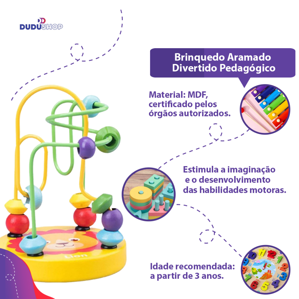 DESCRIÇÃO DO PRODUTO: O Aramado Divertido Pequeno é um brinquedo pedagógico interativo clássico que estimula o exercício da percepção de formas e cores. Possui 2 aramados para que a criança possa mover as peças fazendo movimentos com as mãos, além das peças coloridas em sua base de madeira, não tem peças soltas sendo assim é capaz de entreter toda a criançada com bastante segurança. Estimula a imaginação da criança, auxilia na coordenação motora fina e ajuda na percepção visual e na noção de espaço. ESPECIFICAÇÕES: Código de Barras: 7899474294274 Idade Recomendada: A PARTIR DE 3 ANOS ATENÇÃO: NÃO INDICADO PARA MENORES DE 3 ANOS POR CONTER PARTES PEQUENAS QUE PODEM SER ENGOLIDAS. Material/Composição: MDF INMETRO CE-BRI/BRICS 00163-15 NM 300/2002 OCP 0098 Certificação: Certificado pelos Órgãos Autorizados - OCP´S (Organismos de Certificação de Produtos) Aviso Importante: Todas as informações divulgadas são de responsabilidade exclusiva do fabricante/fornecedor. As cores dos tecidos e produtos podem variar entre as imagens mostradas acima e o produto. Imagens meramente ilustrativas. Largura 17cm x profundidade 11,5cm x altura 10cm