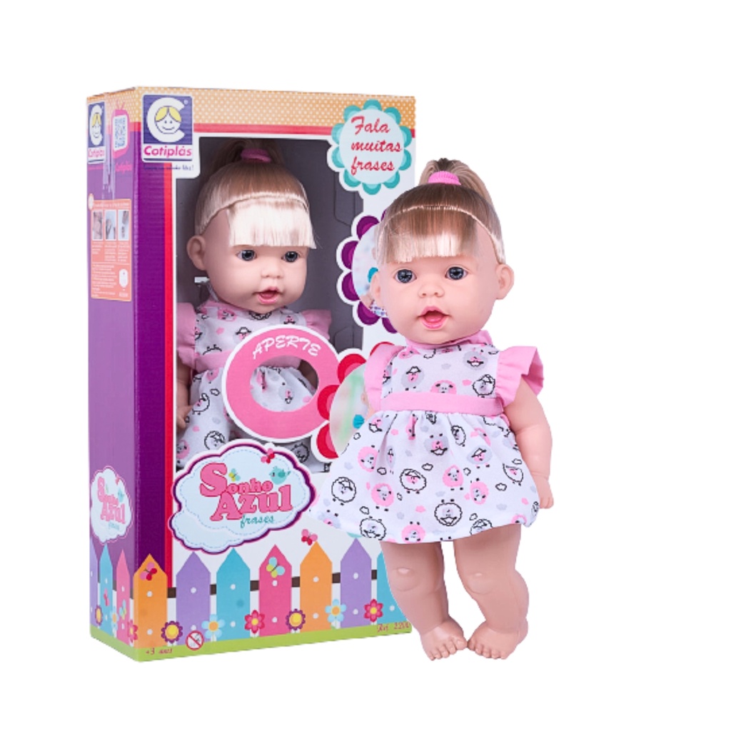 A boneca Sonho Azul, da Cotiplás, é fabricada em materiais de alta qualidade para garantir durabilidade e resistência durante seu uso. Muito fofinha, ela usa um lindo vestidinho e fala diversas frases ao apertar sua barriguinha, auxiliando no aprendizado de fala para as crianças e na imaginação para brincar. Caracteristicas: - Marca: Cotiplás - Modelo: 2200 *Imagens meramente ilustrativas. Especificações: - Idade Recomendada: Acima de 3 anos. - Altura: 41cm - Peso: 465g - Dimensões da Embalagem(cm): 41 x 10 x 23 (alt x larg x comp) - Inmetro: CE-BRI/IQB 0228 IQB-OCP 006 - Material: 100% Vinil (Não utiliza pano) - Cor: Cores variaveis. - Baterias: O Produto necessita de baterias, mas já estão inclusas. Conteúdo da embalagem: - 1x Boneca.