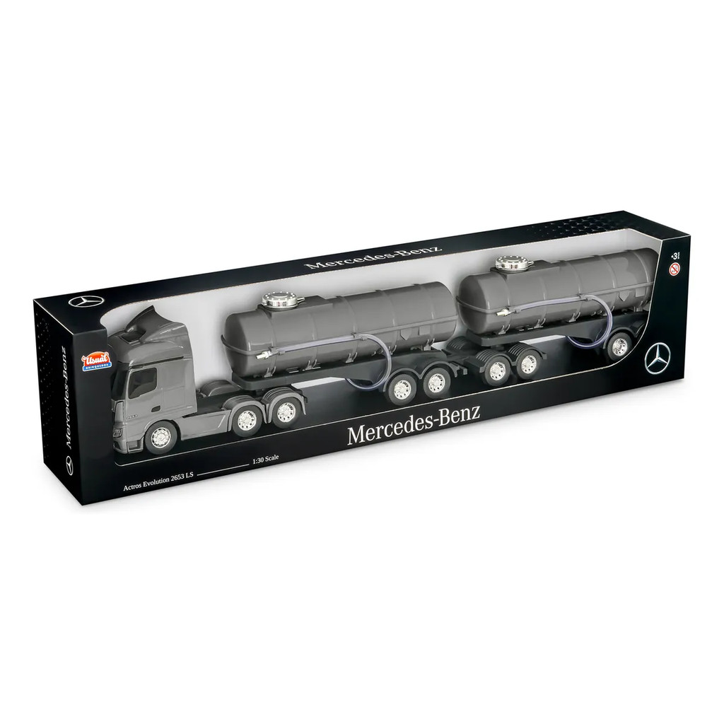 MERCEDES-BENZ RODOTREM TANQUE E para completar a nossa linha de caminhões pesados, a Usual Brinquedos traz o incrível Mercedes-Benz Rodotrem Tanque, uma verdadeira peça de colecionador. Com detalhes precisos que refletem o design robusto do modelo real, o Rodotrem Tanque é ideal para quem ama o universo dos transportes de carga líquida. O modelo miniatura conta com tanque removível e tampas que se abrem, proporcionando uma experiência de simulação de transporte de líquidos. É perfeito tanto para colecionadores como para crianças que buscam um brinquedo dinâmico e funcional. Faz parte da coleção Mercedes-Benz Usual Brinquedos. Colecione! PERGUNTAS FREQUENTES 1 - Qual o tamanho do caminhão? O caminhão possui 14 cm de altura e 70 cm de comprimento. 2 - Produto original? Sim, produto original de fábrica, lacrado. BENEFÍCIOS Estimula o raciocínio Exercita o imaginário Desenvolve a criatividade Promove socialização e interação Estimula habilidades motoras básicas Incentiva a comunicação e linguagem Desenvolve aspectos emocionais e afetivos CARACTERÍSTICAS Fabricação em plástico de alta qualidade Detalhes realistas Portas traseiras que se abrem Grafismo oficial da marca Cores exclusivas da linha Detalhes Cromados FICHA TÉCNICA Marca: Usual Brinquedos Marca do caminhão: Mercedes-Benz Actros Escala: 1/30 Referência: 837 Tamanho caminhão (C x A x L): 74 x 14 x 09 cm Recomendação: Para crianças a partir de 03 anos de idade Embalagem (C x A x L): 78,5 x 18,5 x 13 cm Embalagem (Peso): 0.974 kg Material / Composição: Plástico Nº de Registro: 009922/2019 CONTEÚDO DA EMBALAGEM 1 Caminhão Mercedes-Benz Rodotrem Tanque