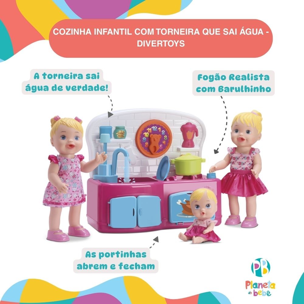 Cozinha Infantil Divertida com Torneira Sai Água - Divertoys As Bonecas NÃO Acompanham a Cozinha Transforme o momento de brincar em uma verdadeira aventura gastronômica com a Cozinha Divertida da Divertoys! Com design moderno, cores vibrantes e detalhes encantadores, essa cozinha infantil é o sonho de qualquer mini chef! Mais do que um brinquedo, é um convite ao mundo do faz de conta, onde a imaginação toma conta e os pequenos exploram a criatividade enquanto desenvolvem habilidades sociais, motoras e de organização. Ideal para brincar com os amiguinhos, ela é equipada com: Pia, Fogão com botão que gira com barulhinho “crec-crec”, Escorredor de Louças, Forninho e Armário, todos com portas que abrem e fecham. Mas, a estrela dessa cozinha é a torneirinha que sai água de verdade! Além de ser um brinquedo completo ela acompanha diversos acessórios para a brincadeira ficar ainda mais divertida, como: panelinha, frigideira, copos, pratos e talheres para as crianças soltarem a imaginação e deixar a brincadeira ainda mais real! Este brinquedo não é apenas divertido, mas também auxilia no desenvolvimento de habilidades motoras finas, coordenação olho-mão e habilidades sociais. A Cozinha Divertida Infantil da Divertoys é o presente perfeito para a criança que adora brincar de casinha, imitando os adultos e se divertindo em um mundo de faz de conta. Atenção! Não recomendável para menores de 3 anos por conter peças pequenas que podem ser engolidas. Principais Características: - Idade Recomendada: A Partir de 3 Anos - As Bonecas NÃO Acompanham a Cozinha - Pia com Torneira que Sai Água de Verdade - Acompanha Pratos, Copos, Talheres e Panelas - Fogão com Botão que Gira “Crec-Crec” - Forno e Micro-ondas com Portinha Abre e Fecha - Possui Escorredor de Louças - Ideal para Soltar a Imaginação - Muita Brincadeira e Diversão Garantida com os Amigos - Aprovado Pelo Inmetro Especificações Técnicas: - Conteúdo da Embalagem: 1 Cozinha Divertida com Torneira Sai Água - Divertoys - Dimensões do Produto (AxLxP): 35,0 x 29,0 x 19,0 cm - Composição/Material: Plástico - Peso do Produto: 1,280kgs - Garantia: 30 dias (Contra Defeitos de Fabricação Pelo Fabricante) - Certificação: INMETRO: 002384/2022 - Código do Fabricante: 8055 - EAN: 7898639380555 - Marca: Divertoys Imagens Meramente Ilustrativas. As cores e estampas podem variar de acordo com o lote do fabricante.