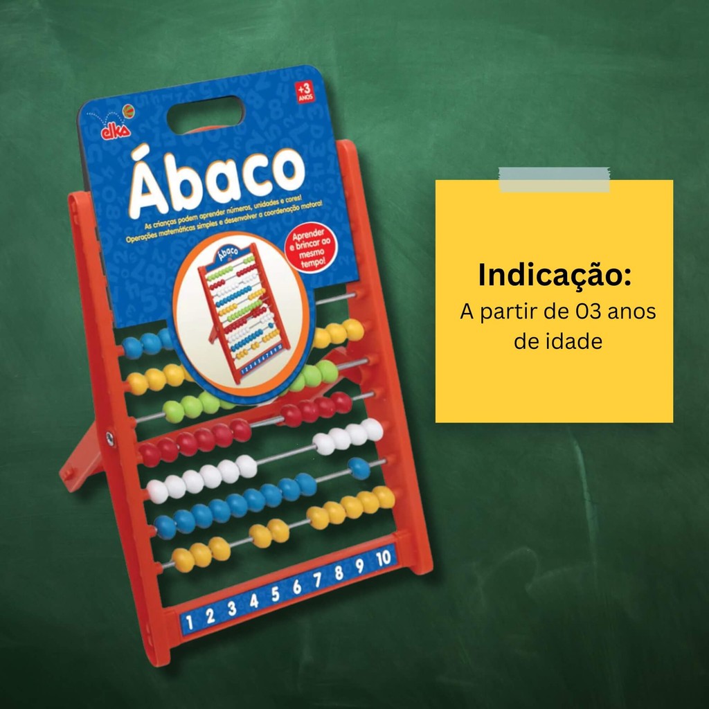 Aprender e brincar ao mesmo tempo é tudo de bom! As crianças podem aprender números, unidades e cores além de operações matemáticas simples com o Ábaco Escolar! Um brinquedo que desenvolve a coordenação motora e o raciocínio da criança. Medidas do produto: 26cmx20cm Indicação: A partir de 03 anos de idade Material: Plástico, PVC atóxico e adesivo Características: - Marca:Elka - Modelo:512 *Imagens Meramente Ilustrativas* Conteúdo da Embalagem: - 01 Ábaco