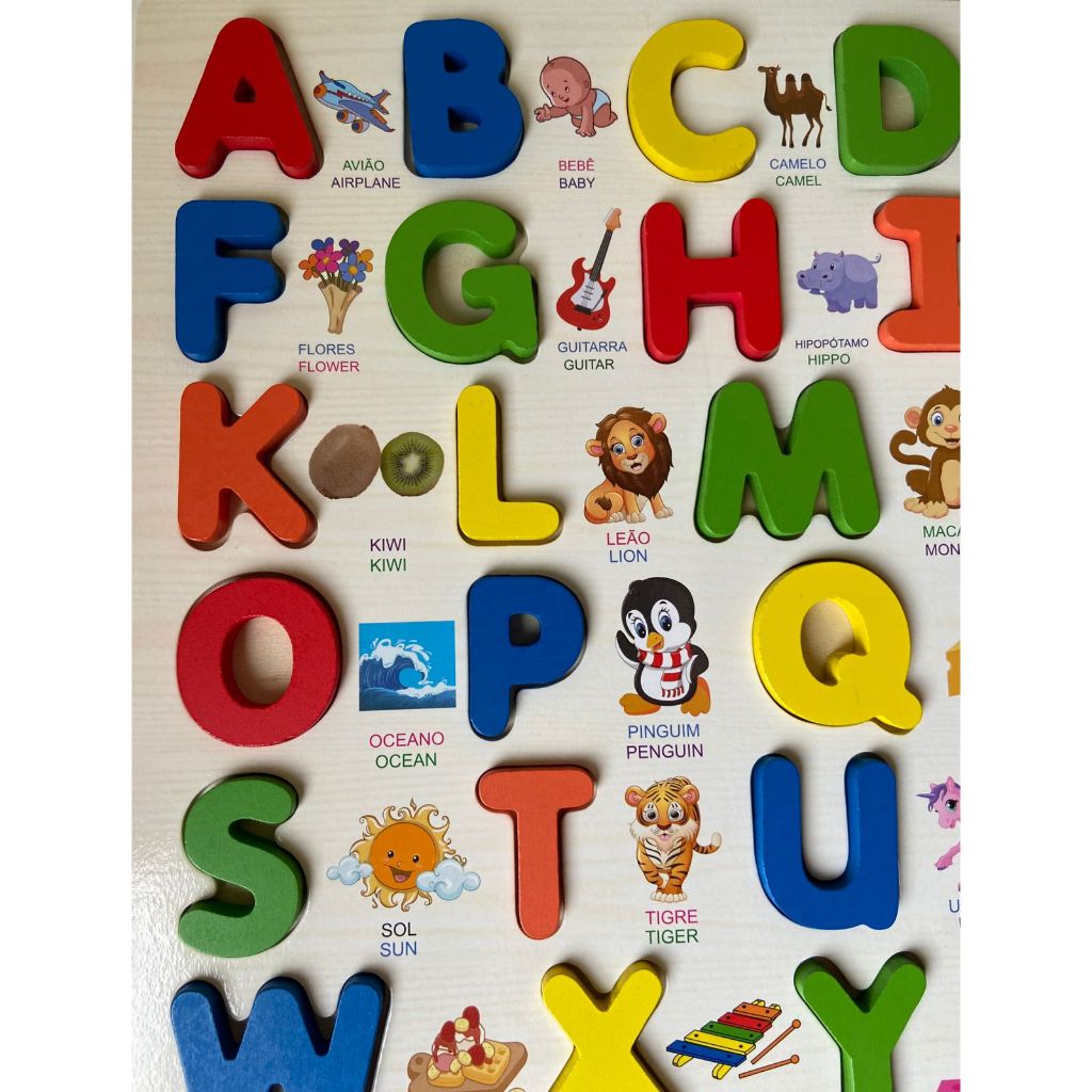 INFORMAÇÕES IMPORTANTES - As fotos são reais - Os produtos são novos e enviado lacrado - Temos pronta entrega, despachamos em até 24 horas da confirmação de pagamento - Em caso de dúvidas, estamos à disposição no chat Transforme o aprendizado em diversão! Este brinquedo de madeira traz todas as letras do alfabeto acompanhadas de imagens ilustrativas e palavras em português e inglês, ajudando as crianças a desenvolverem: 🌟 Reconhecimento das letras 🌟 Associação de imagens e palavras 🌟 Aprendizado bilíngue desde cedo 🌟 Coordenação motora e memória visual Peso e medidas: L x C: 30 x 30 cm P: 330 gramas