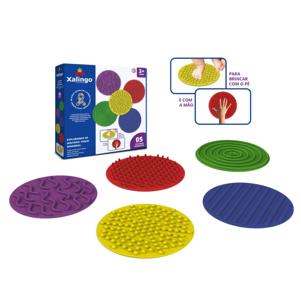 Explorando os Sentidos Toque - Brinquedo Educativo Terapêutico para Desenvolvimento Psicomotor Esta brincadeira é curiosa e divertida, a criança sentirá com os pés e as mãos, as texturas de 5 tapetes de cores e texturas diferentes, experimentando novas sensações táteis em cada um e estimulando a sensibilidade de maneira interativa, que irá despertar inclusive reações emocionais. Promove também o amadurecimento da coordenação motora e equilíbrio. Será muito divertido ver a reação dos pequenos diante de novas texturas. É um produto para apoio ao desenvolvimento psicomotor das crianças, um divertido material para desenvolver e amadurecer as habilidades dos pequenos, utilizado por terapeutas ocupacionais, psicólogos infantis, professores entre outros e é muito difundido nas escolas para apoio ao aprendizado. O desenvolvimento da coordenação motora, percepções táteis e visuais tem papel representativo no amadurecimento dos pequenos, facilitando a prática de tarefas como a escrita, dando apoio a alfabetização e outras tarefas diárias que requeiram firmeza e direção preciso dos movimentos menores. Além do tato, também aprimora a coordenação motora, percepções ligadas a lateralidade, organização espacial e temporal, domínio sobre o próprio corpo, além de aspectos emocionais e cognitivos, discriminação de cores e nomeações, tudo para auxiliar o desenvolvimento das crianças brincando. Idade sugerida: +3 anos Composição: borracha Medida aproximada do produto: 15 cm de diâmetro Certificado INMETRO: CE-BRI/IQB 005923 Características: - Marca:Xalingo - Modelo:12298 *Imagens Meramente Ilustrativas* Conteúdo da Embalagem: - 5 círculos de borracha com cores e texturas diferentes