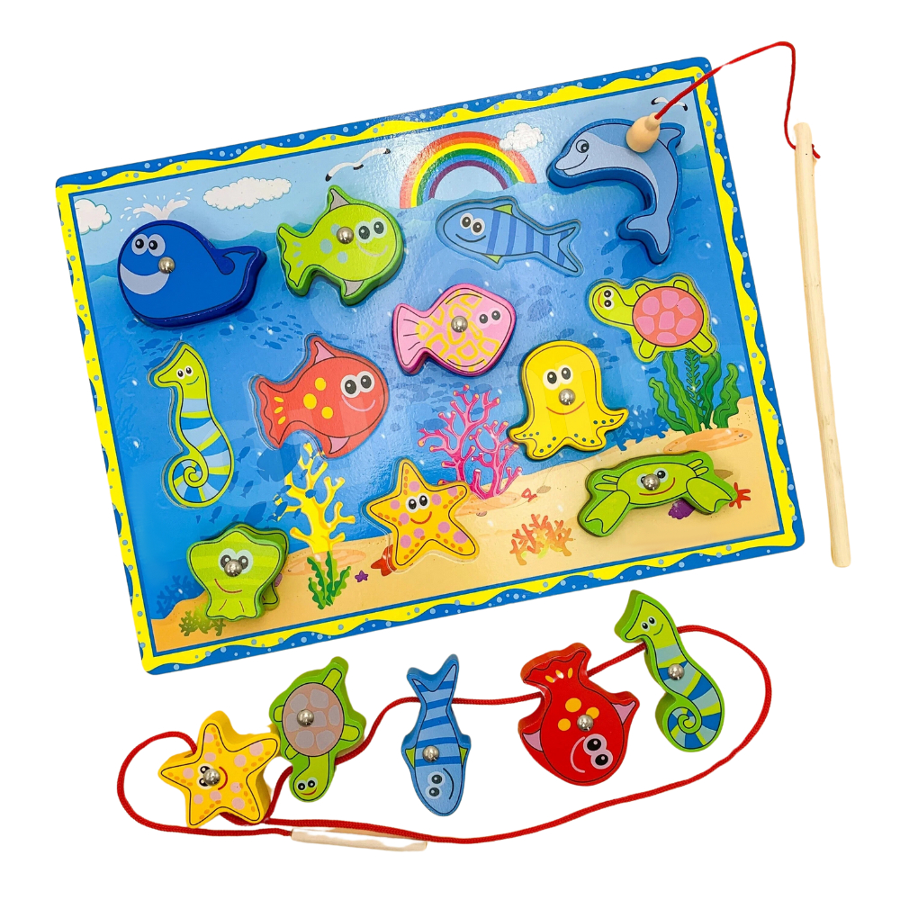 A pescaria magnética é um quebra-cabeça incrível, cheio de possibilidades para explorar! Seja encaixando, pescando, alinhavando ou brincando com a imaginação, as crianças irão se divertir muito! ❤️Confeccionado em madeira, com peças grossas e resistentes (os animais ficam em pé), este brinquedo é indicado a partir de 3 anos. Certificação INMETRO CE-BRI/BRICS 00163-15 NM 300/2002 OCP 0098 Dimensões aproximadas do produto C x L x A: 30 x 23 x 0,7cm Peixinhos com aproximadamente 7 mm.